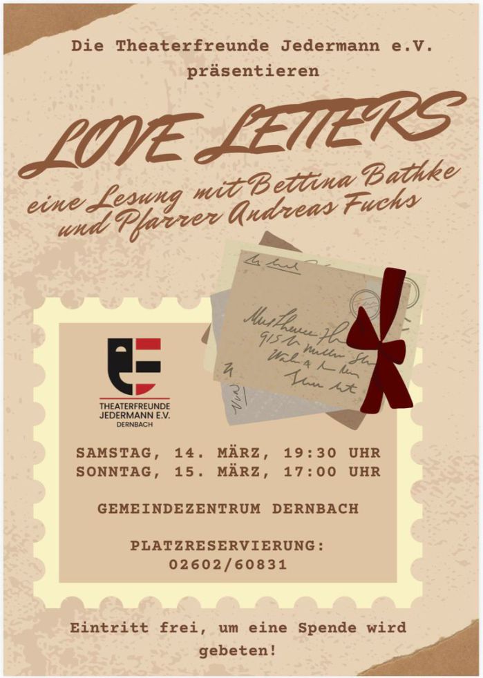 25 Jahre Theaterfreunde Jedermann – die Theatergruppe startet in das Jubiläumsjahr mit einer ganz besonderen Veranstaltung: Nur ein Tisch und zwei Stühle. Eine Frau und ein Mann. Dazu eine Kiste voller Liebesbriefe.
